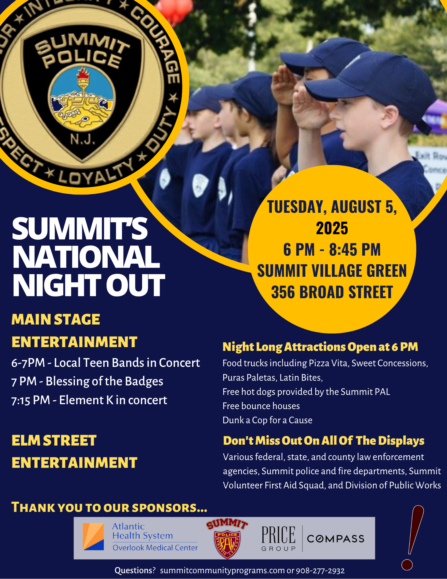 The event features displays and demonstrations from various federal, state, and county law enforcement agencies, in addition to the Summit police and fire departments, Summit Volunteer First Aid Squad, and Division of Public Works.